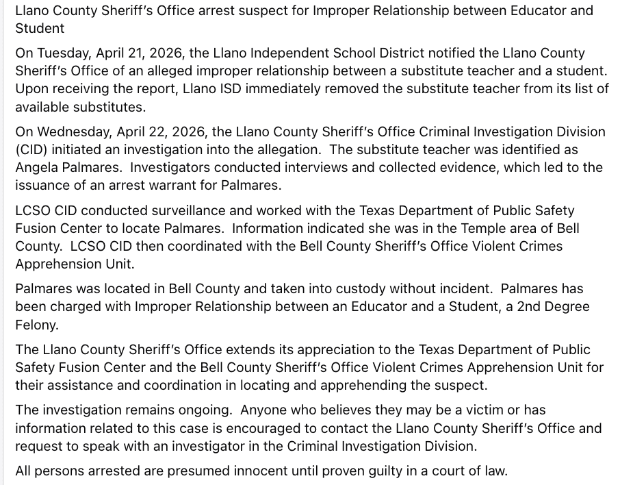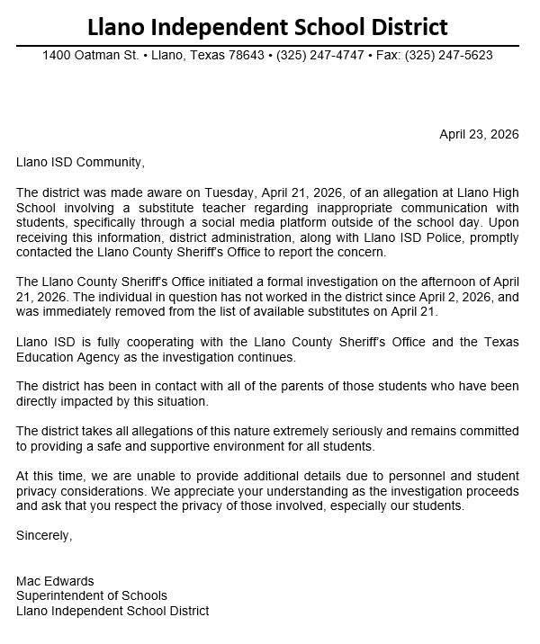 “The district was made aware on Tuesday, April 21, 2026, of an allegation at Llano High School involving a substitute teacher regarding inappropriate communication with students, specifically through a social media platform outside of the school day,” wrote Edwards.