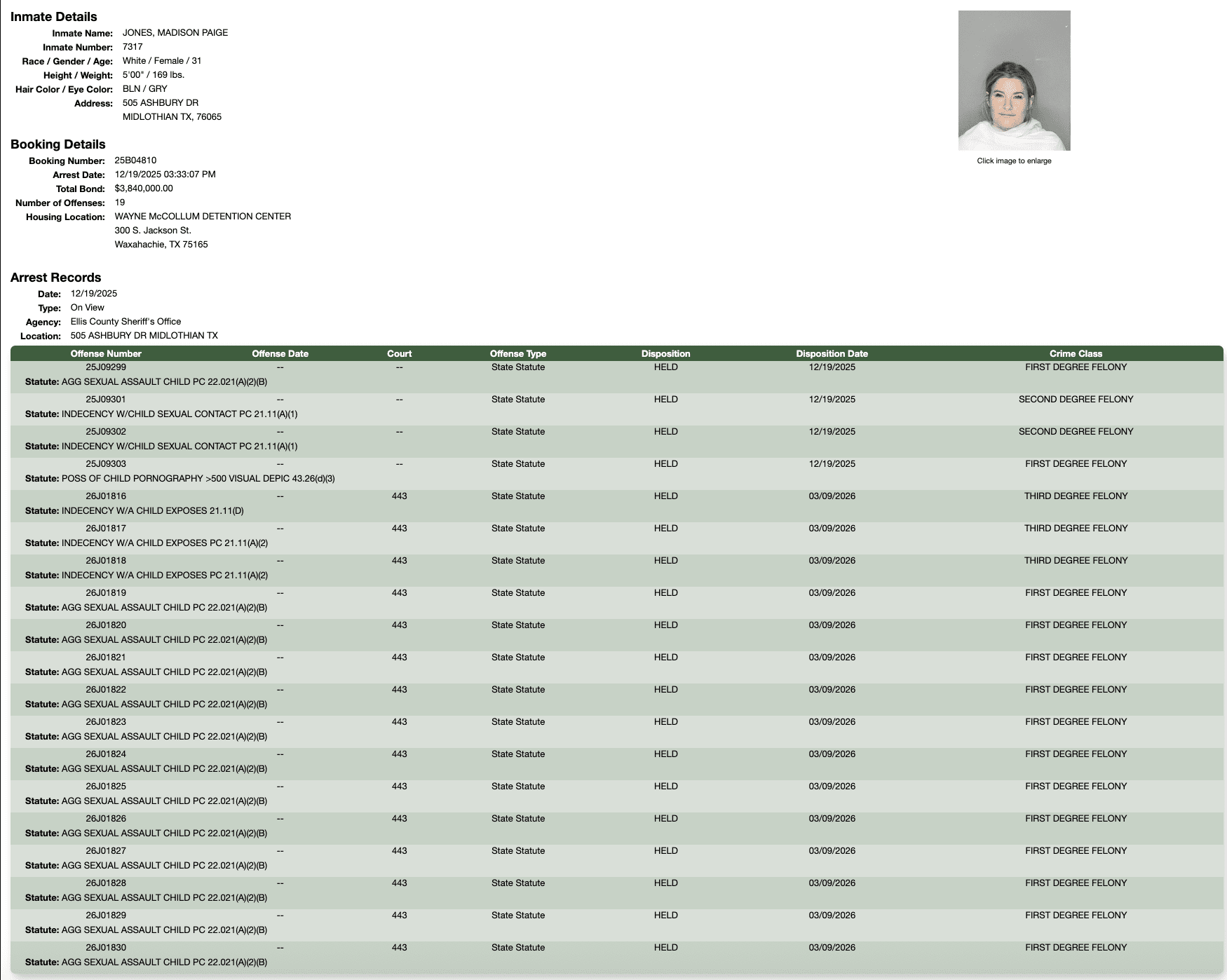Jones, 31, was a substitute teacher in the Midlothian Independent School District at the time of her arrest on charges of aggravated sexual assault of a child and possession of more than 500 images of child sexual abuse material.