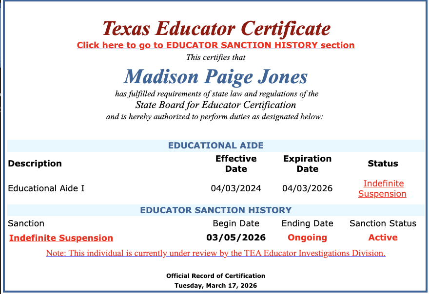 Jones received a Texas teaching certificate as an educational aide in April 2024. Her certification is now on “indefinite suspension” until the criminal case against her is resolved.
