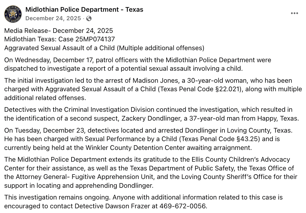 Following Jones’ arrest in December, Midlothian ISD officials notified families with students at Baxter Elementary and Heritage High School that a substitute teacher (who they did not name) had been charged with sex crimes but added there was “no indication” the charges were related to her teaching role or that “anything occurred at an MISD campus or activity.”