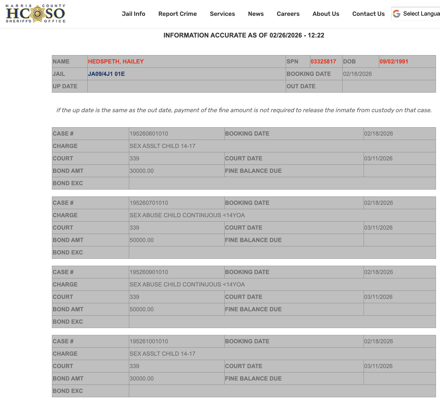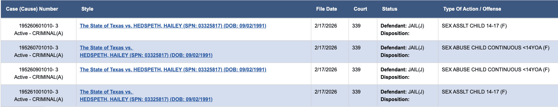 Hedspeth was booked into the Harris County Jail on February 18. Total bonds were set at $160,000.