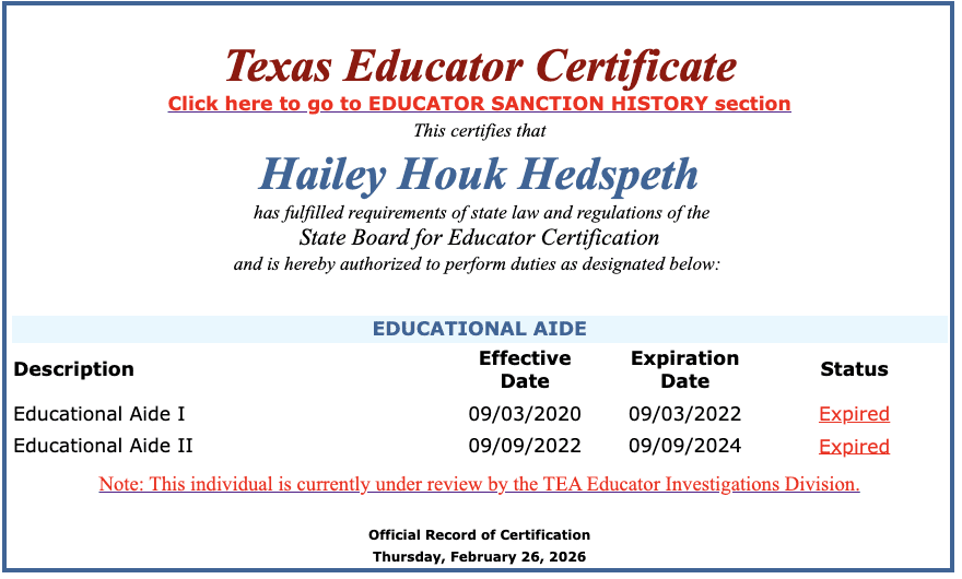 She was certified as an educational aide in 2020. Hedspeth’s certification expired in September 2024, but she is still under TEA review.