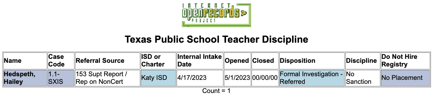 According to the district, she resigned in 2023. Katy ISD reported Hedspeth to the Texas Education Agency in April 2023 for in-school sexual abuse (SXIS).