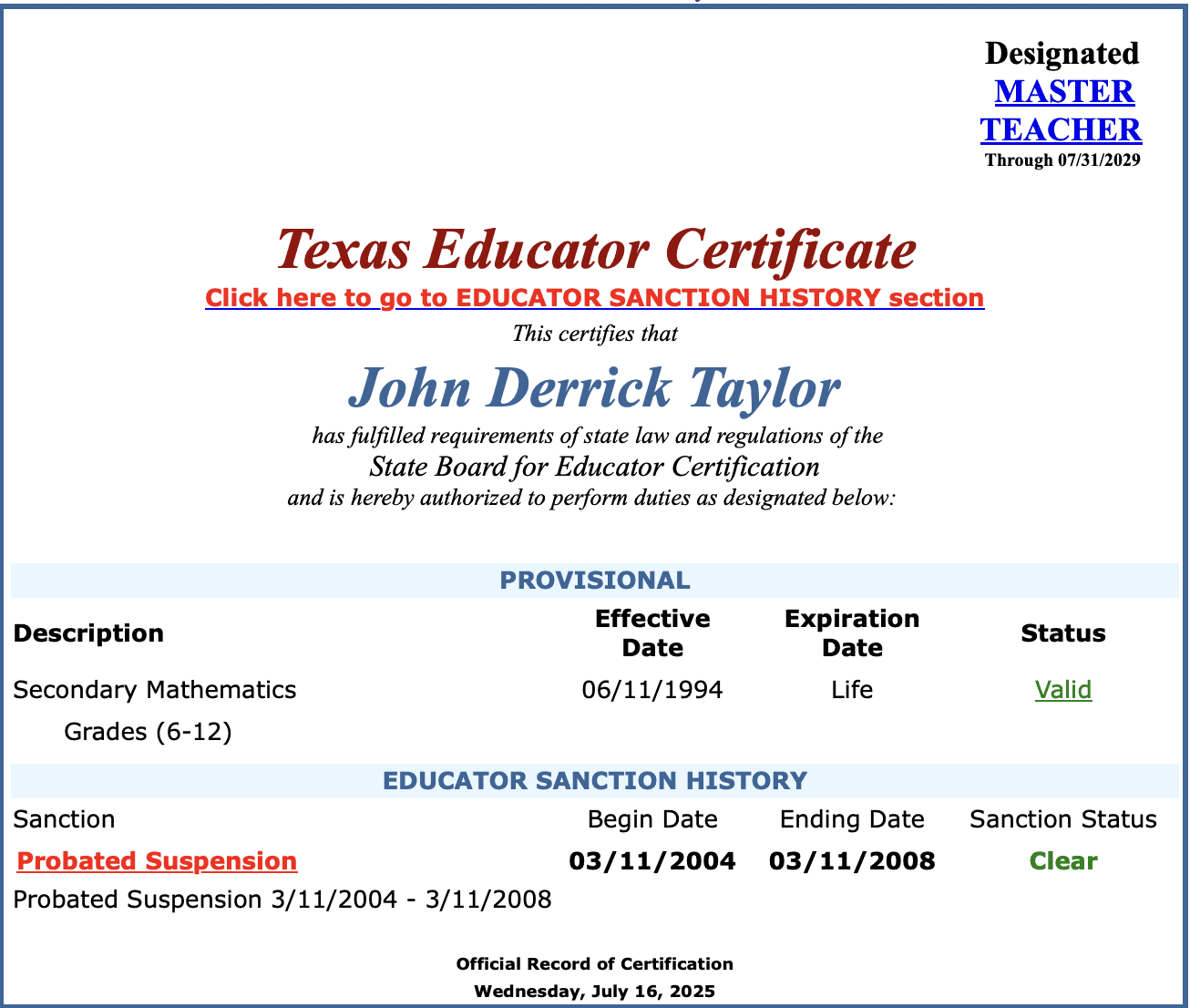 According to the State Board for Educator Certification, Taylor was placed on probated suspension from 2004-2008. His certificate is not currently flagged as under investigation.