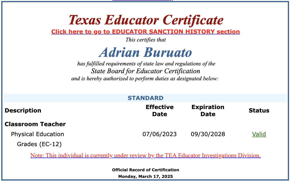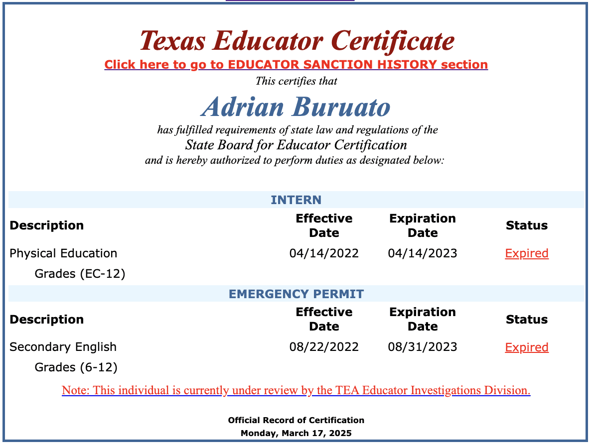 State records show Buruato was certified as a classroom teacher in July 2023. He was previously issued a one-year intern teaching certificate for physical education in April 2022 and a one-year emergency permit to teach secondary English in August 2022. His certifications are now under review by the Texas Education Agency.