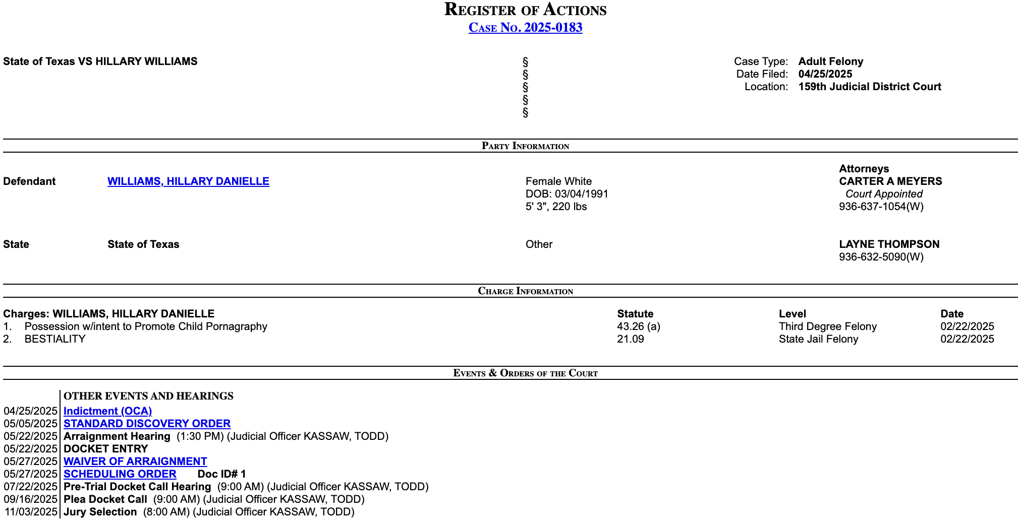 Authorities alleged Williams and her boyfriend had sexually explicit images of an elementary school-age child and video of Williams performing a sexual act on a male dog on their phones. The couple claimed they had been victims of childhood sexual abuse.