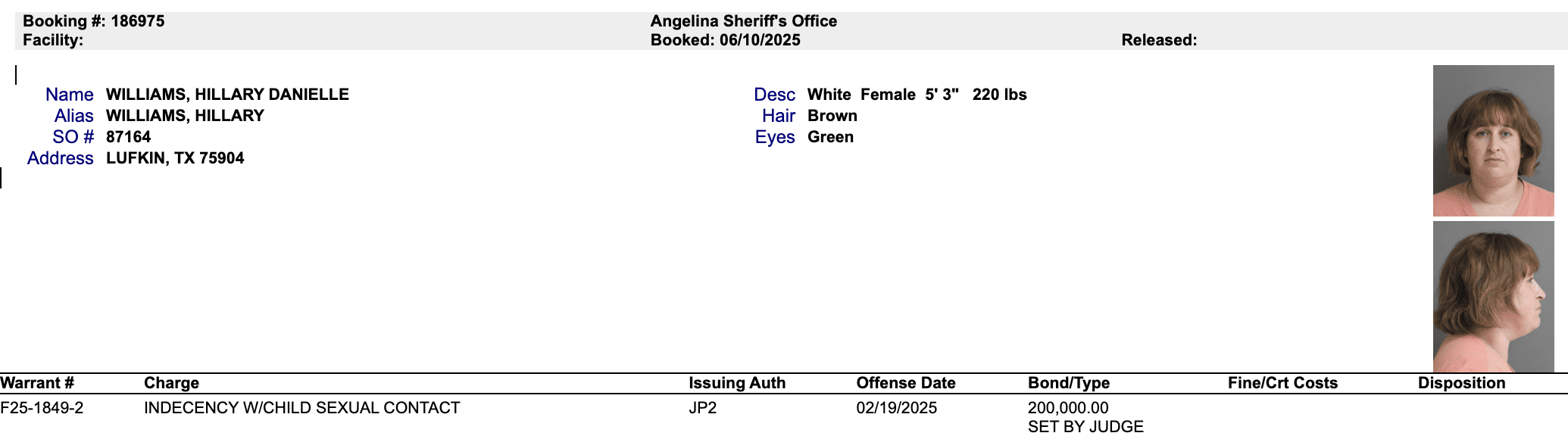 On June 5, Angelina County Sheriff’s Office investigators obtained a warrant for Williams’ arrest on the new charge.