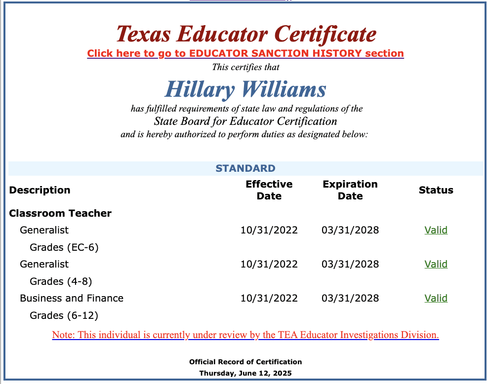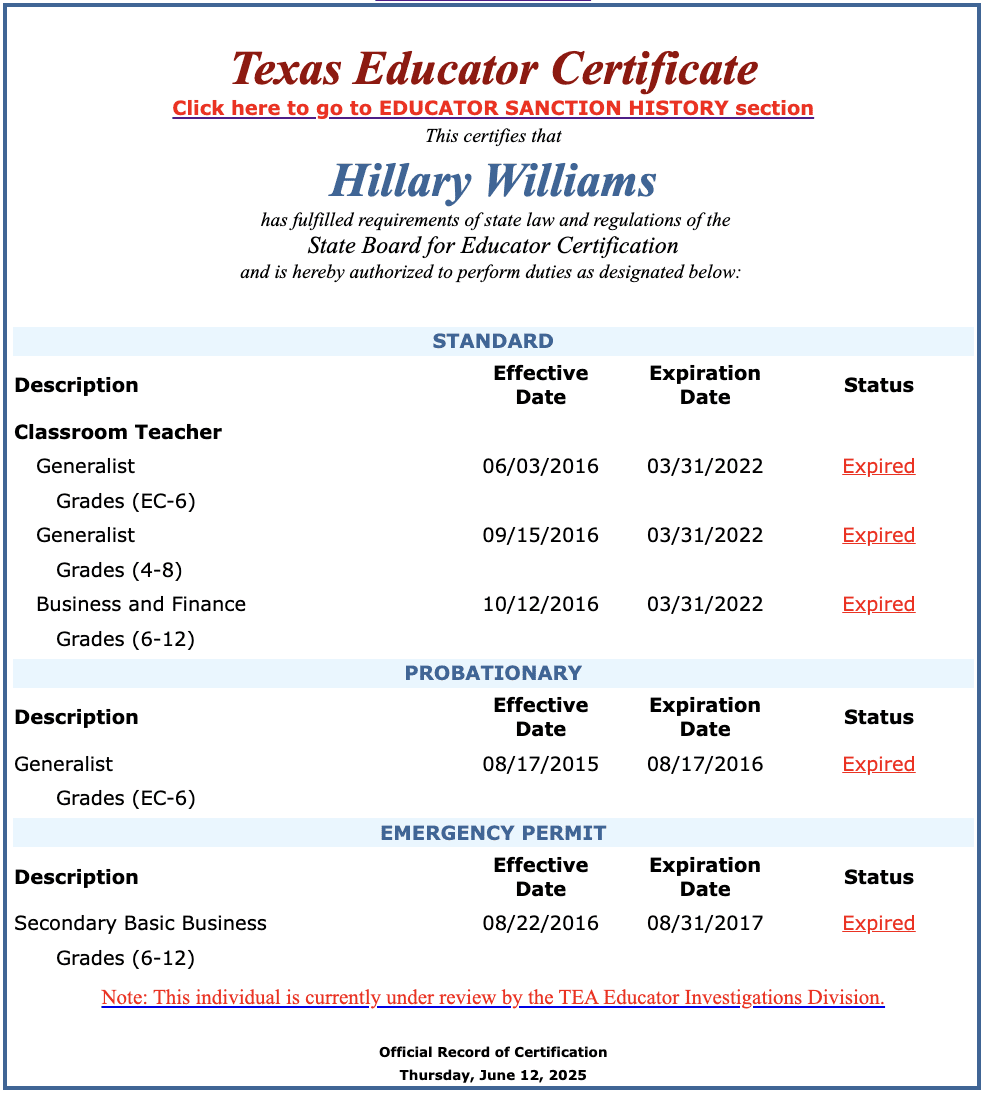 State records show Williams’ current certificate is under review by the Texas Education Agency.