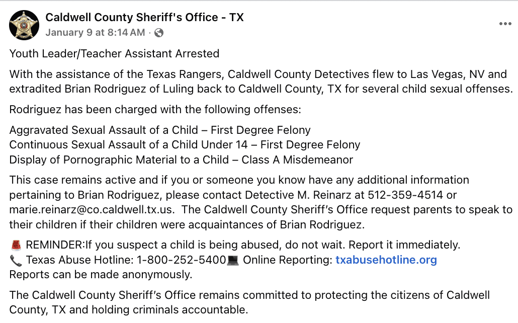 “With the assistance of the Texas Rangers, Caldwell County Detectives flew to Las Vegas, NV and extradited Brian Rodriguez of Luling back to Caldwell County, TX for several child sexual offenses,” according to the statement released on January 9.