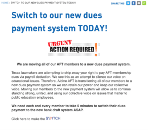 The signup forms for individual organizations like the Houston Federation of Teachers, Austin Community College AFT, Bastrop AFT, and Corpus Christi AFT, to name a few, all read the same: that they are transitioning to private dues collection “so we can retain our power and keep our collective voice. Moving our members to the new payment system will allow us to continue standing strong, united, and using our collective voice on issues that matter to public education employees.”