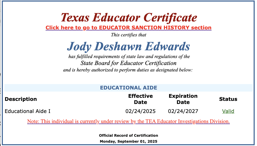 State records show Edwards was certified as an educational aide in February 2025. His teaching certificate is under review by the Texas Education Agency.
