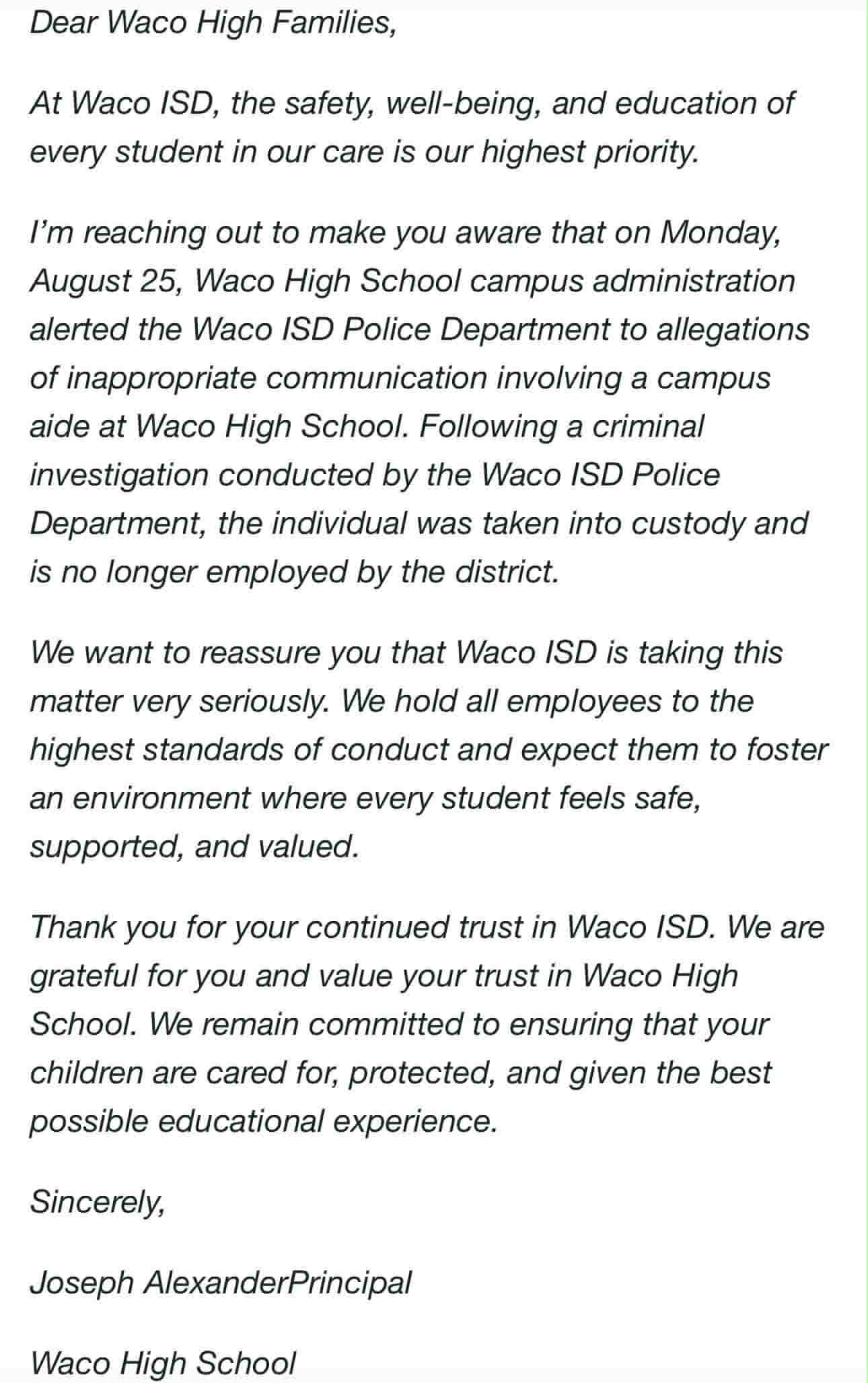 Waco High School Principal Joseph Alexander notified families by email about the arrest of an unnamed campus aide.