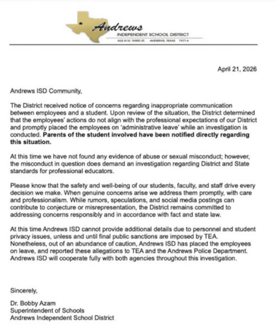 Andrews Independent School District notified the community on April 21 that an unnamed employee had been placed on administrative leave after the district received concerns regarding inappropriate communication between the educator and a student.