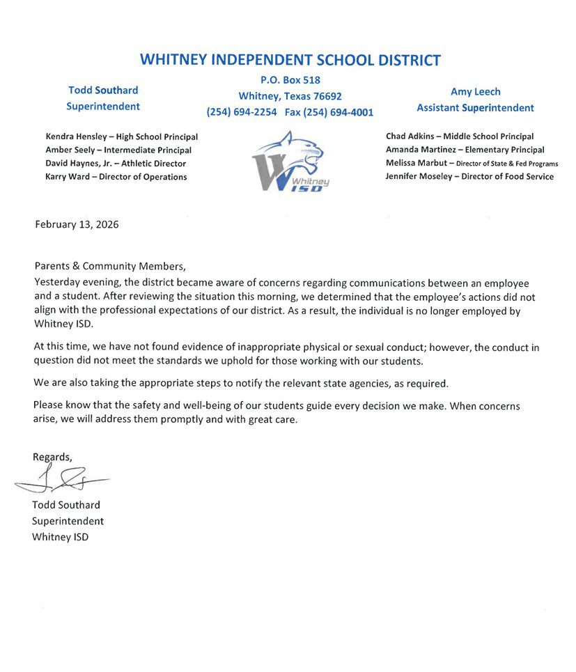“Yesterday evening, the district became aware of concerns regarding communications between an employee and a student,” wrote Southard. “After reviewing the situation this morning, we determined that the employee’s actions did not align with the professional expectations of our district. As a result, the individual is no longer employed by Whitney ISD.”
