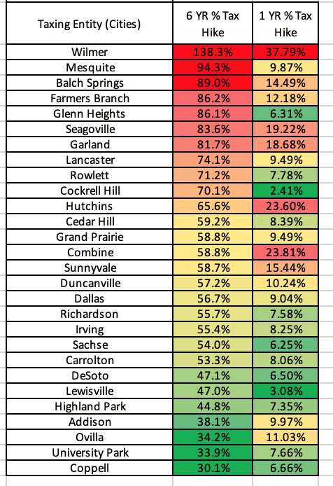 According to data from the Dallas Central Appraisal District, 27 city councils hiked their average property tax bills for homeowners last year. City councils of Wilmer, Combine, and Hutchins were delivered one-year hikes of over 37 percent and over 23 percent, respectively. Only Lewisville and Cockrell Hill hiked such bills no higher than 3.08 percent from 2018.