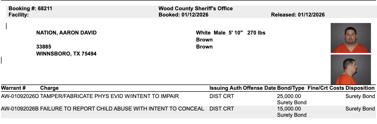 Winnsboro ISD Superintendent Aaron David Nation, 39, was charged with failure to report child abuse with intent to conceal and with tampering with or fabricating physical evidence with intent to impair.