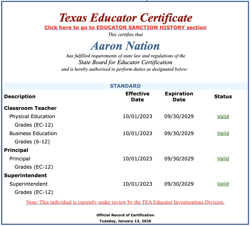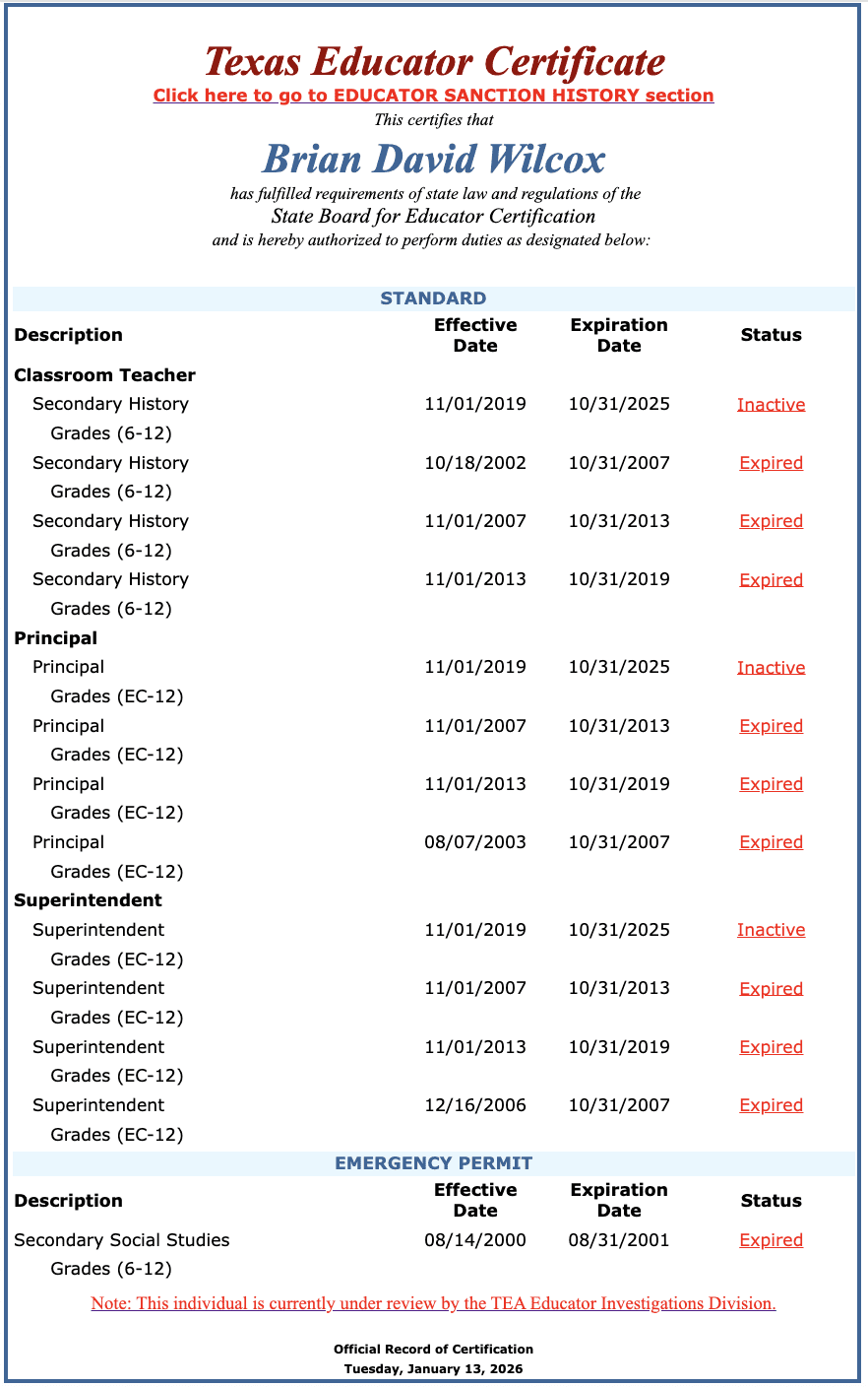 Nation holds a superintendent certification which is currently under review by the TEA. Wilcox’s certification expired on October 31, 2025.