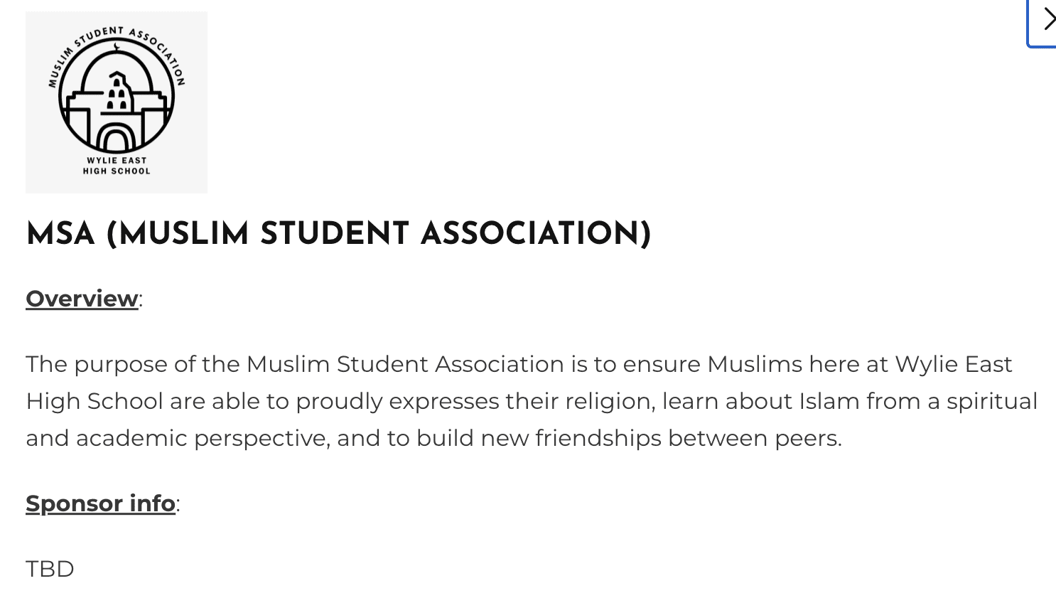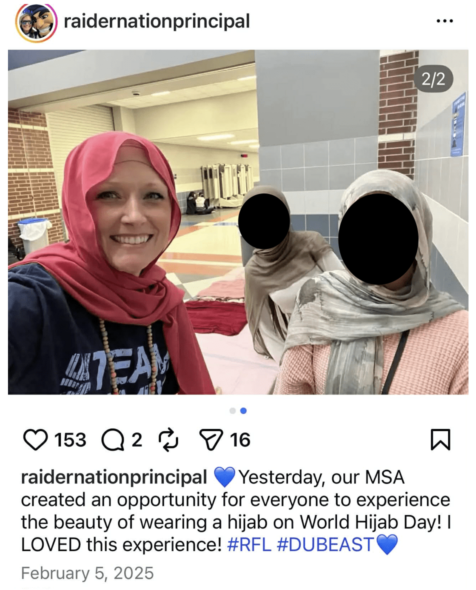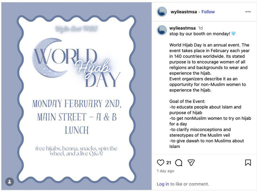 In February 2025, Wylie East Principal Tiffany Doolan posted an image on Instagram of herself wearing a hijab on campus as part of last year’s World Hijab Day celebration organized by MSA students. “I LOVED this experience!” wrote Doolan.