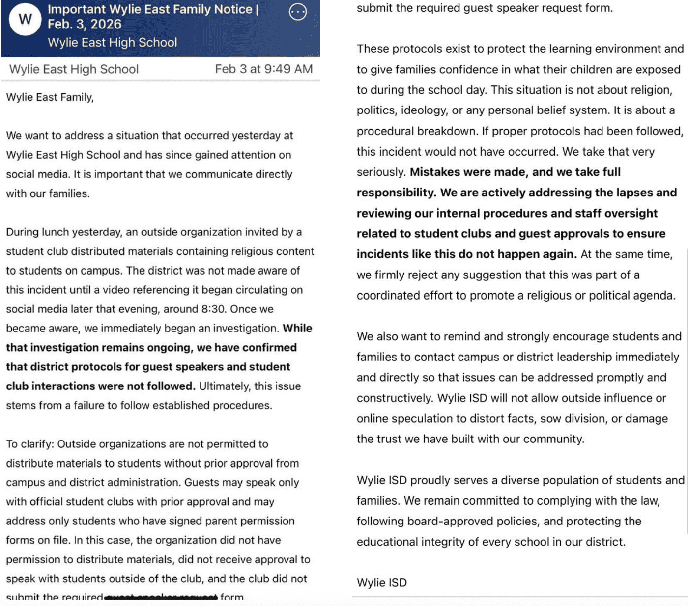 In a statement sent to Wylie East families Tuesday morning, district officials took “full responsibility” for the incident.