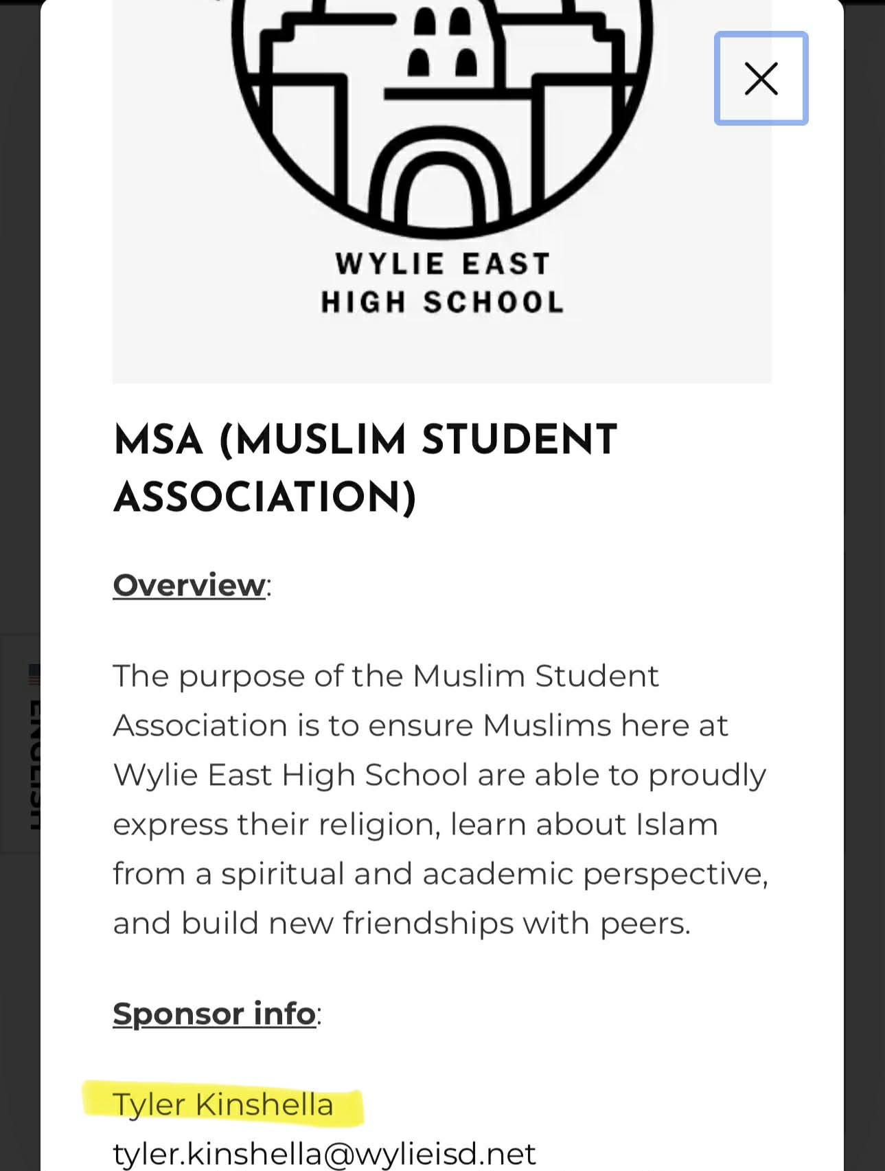 At the time of the incident, the Wylie East website showed that the Muslim Student Association did not have a staff sponsor; now teacher Tyler Kinshella is shown as the MSA sponsor.