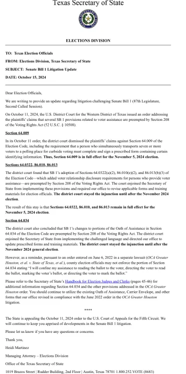 A litigation update issued Tuesday to county election officials by the Texas Secretary of State’s Elections Division noted that challenged provisions of SB 1 for which claims were dismissed or an injunction was stayed remain in full effect for the November 5, 2024 General Election.