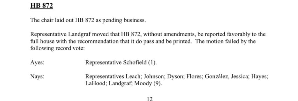 The vote on HB 872 came late enough in the legislative session that the committee could have simply declined to take action. Instead, the committee formally voted down the bill by a 9–1 margin, with State Rep. Mike Schofield (R–Katy) the only vote in favor.