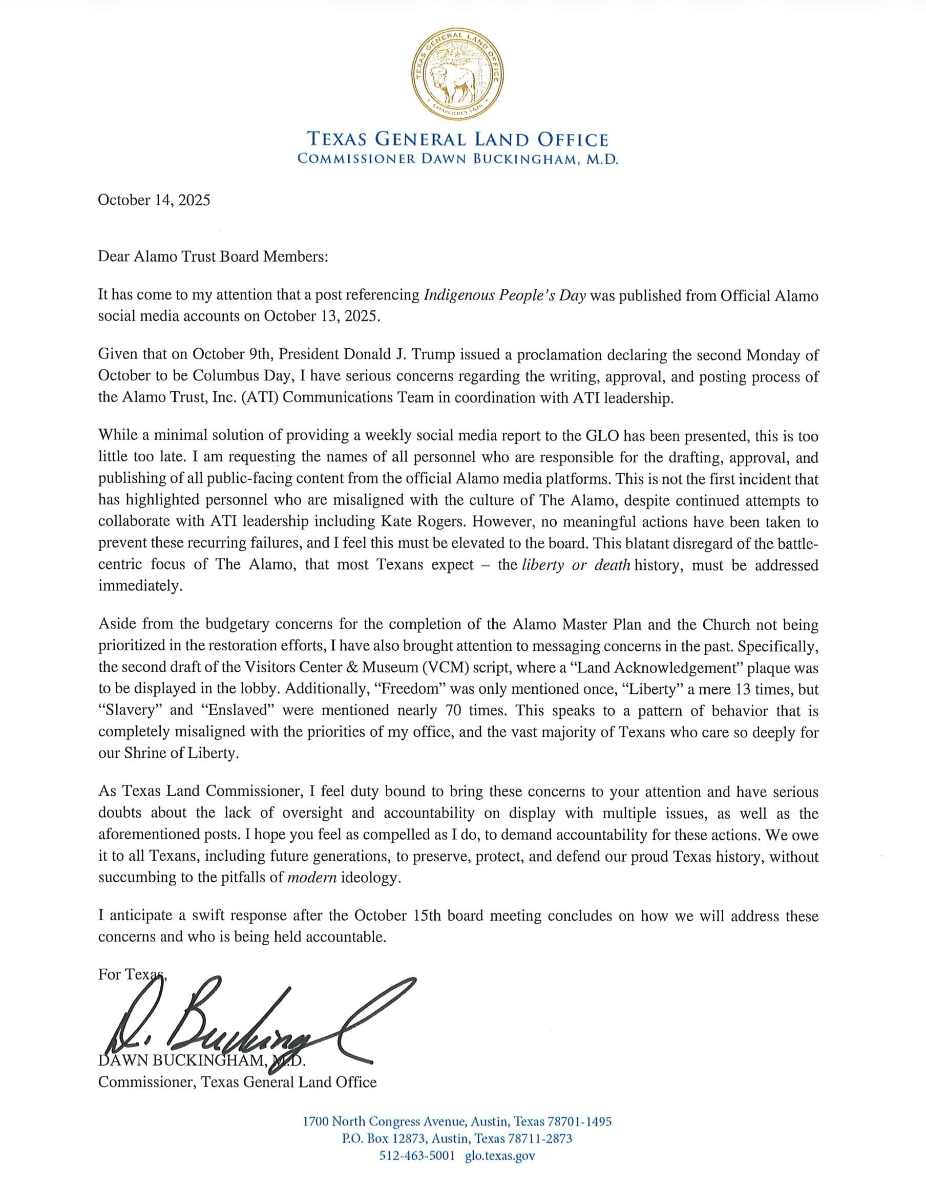 Buckingham’s letter ends by calling for a full report to the GLO following the Alamo Trust’s October 15 board meeting, at which she expects the issue of oversight—and potential personnel changes—to be addressed directly.