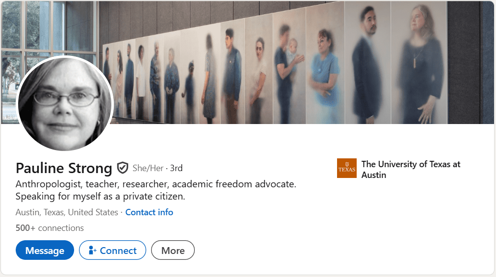 Texas Scorecard reviewed Professor Strong’s university bio, salary information, academic writing, course syllabi, social media accounts (primarily X), campaign donations, and media interviews.