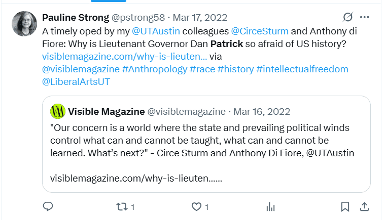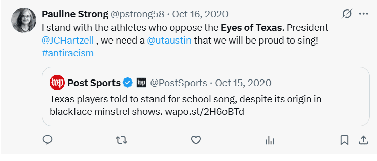 Consistent with her stances on team names documented above, in 2020, Strong attacked her employer’s iconic fight song, “The Eyes of Texas.” She closed her tweet with the hashtag “#antiracism.”