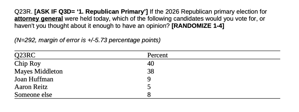 Roy leads with 40 percent support among likely Republican primary voters, while Middleton follows closely at 38 percent. State Sen. Joan Huffman received 9 percent and former DOJ official Aaron Reitz 5 percent.