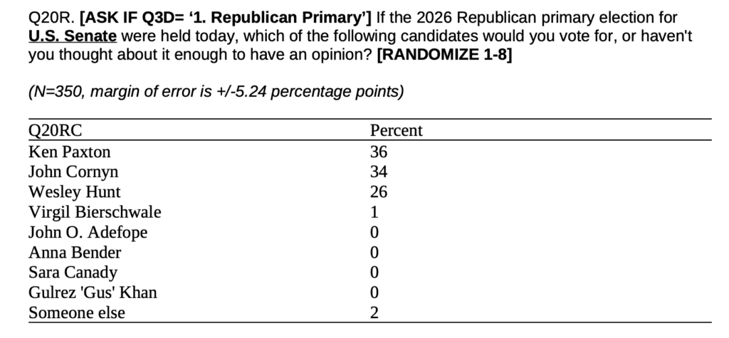 The Republican U.S. Senate primary also remains highly competitive. Attorney General Ken Paxton leads with 36 percent support, followed closely by U.S. Sen. John Cornyn at 34 percent and U.S. Rep. Wesley Hunt at 26 percent.