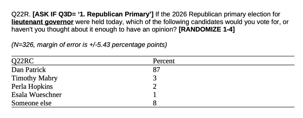 Lt. Gov. Dan Patrick similarly dominates his primary field with 87 percent backing.