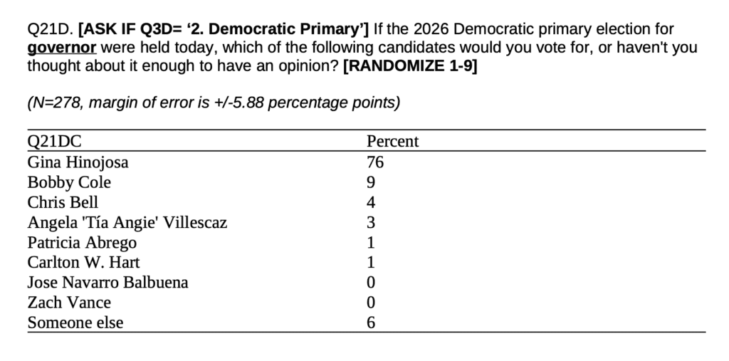 On the Democrat side, State Rep. Gina Hinojosa leads the gubernatorial primary with 76 percent support.