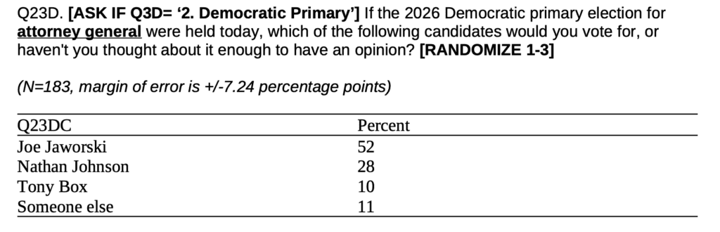 In the Democrat attorney general contest, Joe Jaworski leads with 52 percent, followed by State Sen. Nathan Johnson at 28 percent and Tony Box at 10 percent.