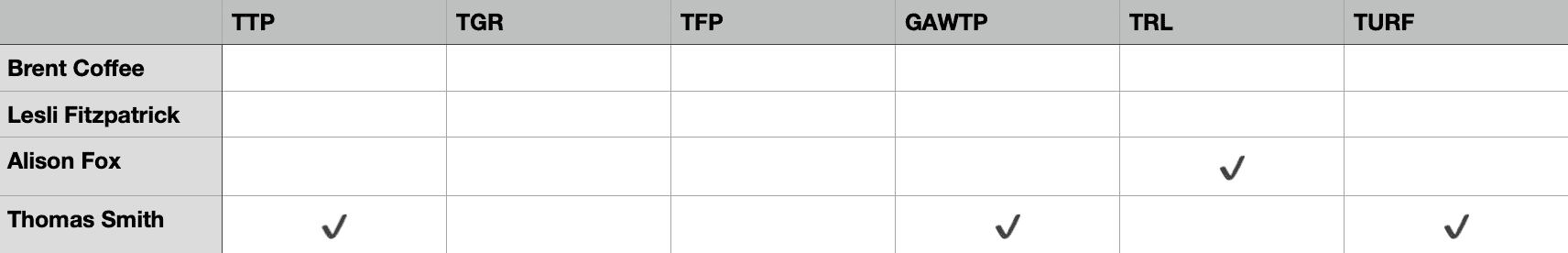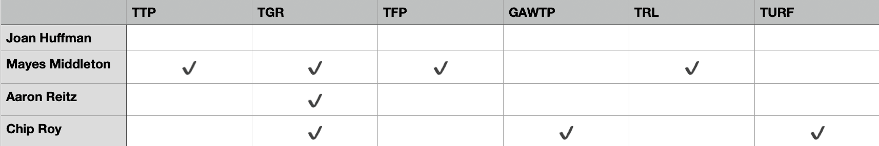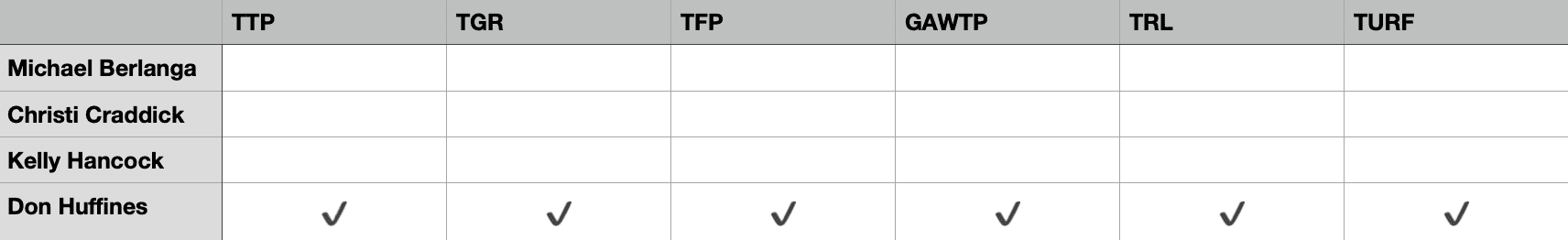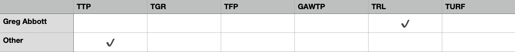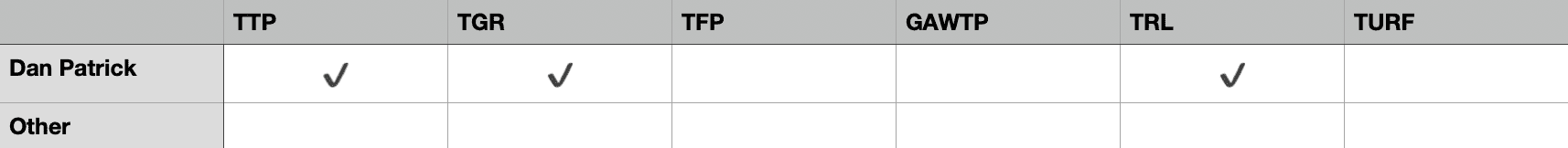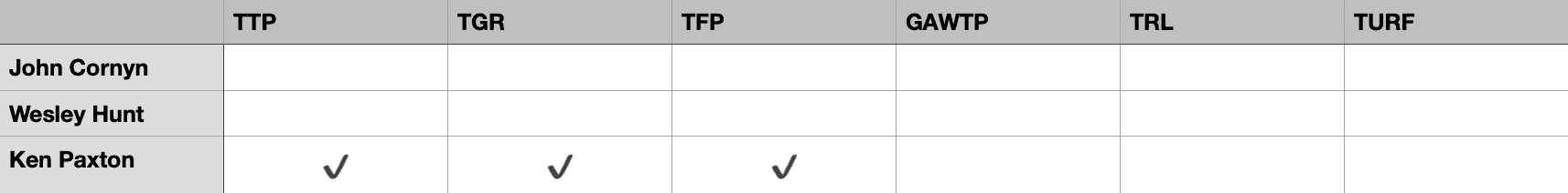 The endorsements considered include: True Texas Project (TTP), Texas Gun Rights (TGR), Texas Family Project (TFP), Grassroots America: We The People (GAWTP), Texas Right to Life (TRL), and Texans Uniting for Reform and Freedom (TURF).