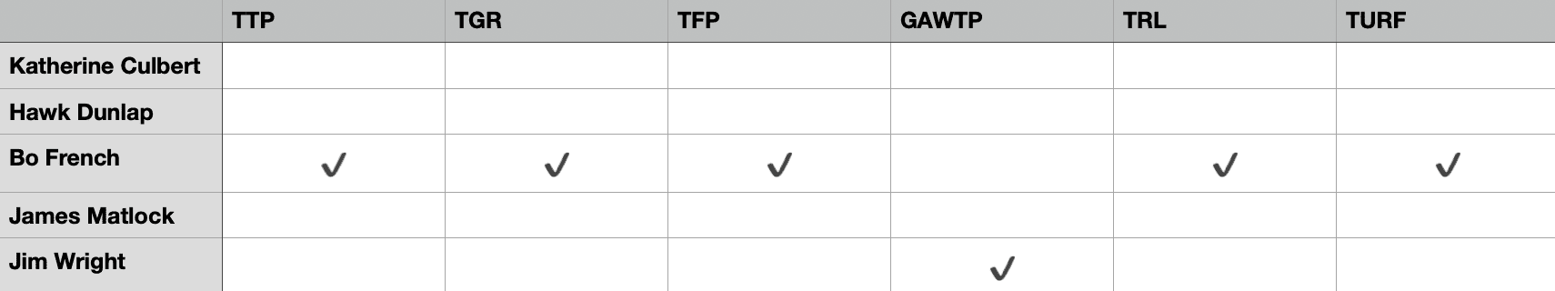 Incumbent Railroad Commissioner Jim Wright is being challenged by Katherine Culbert, Hawk Dunlap, Bo French, and James (Jim) Matlock.