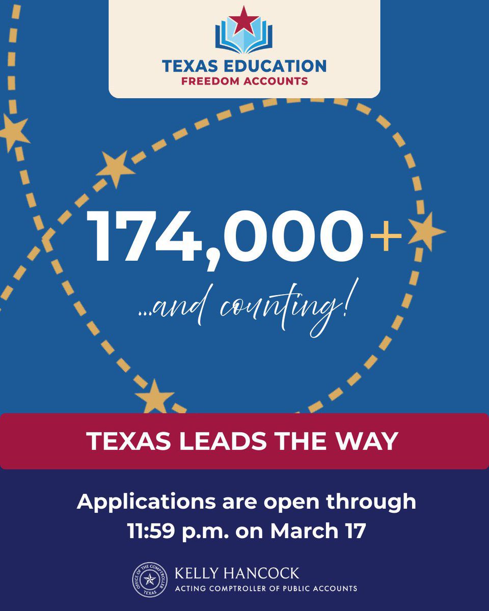 With a week still remaining for families to submit applications for the Texas Education Freedom Accounts, the Office of the Comptroller has announced that more than 174,000 students have applied for the 2026-2027 school year.