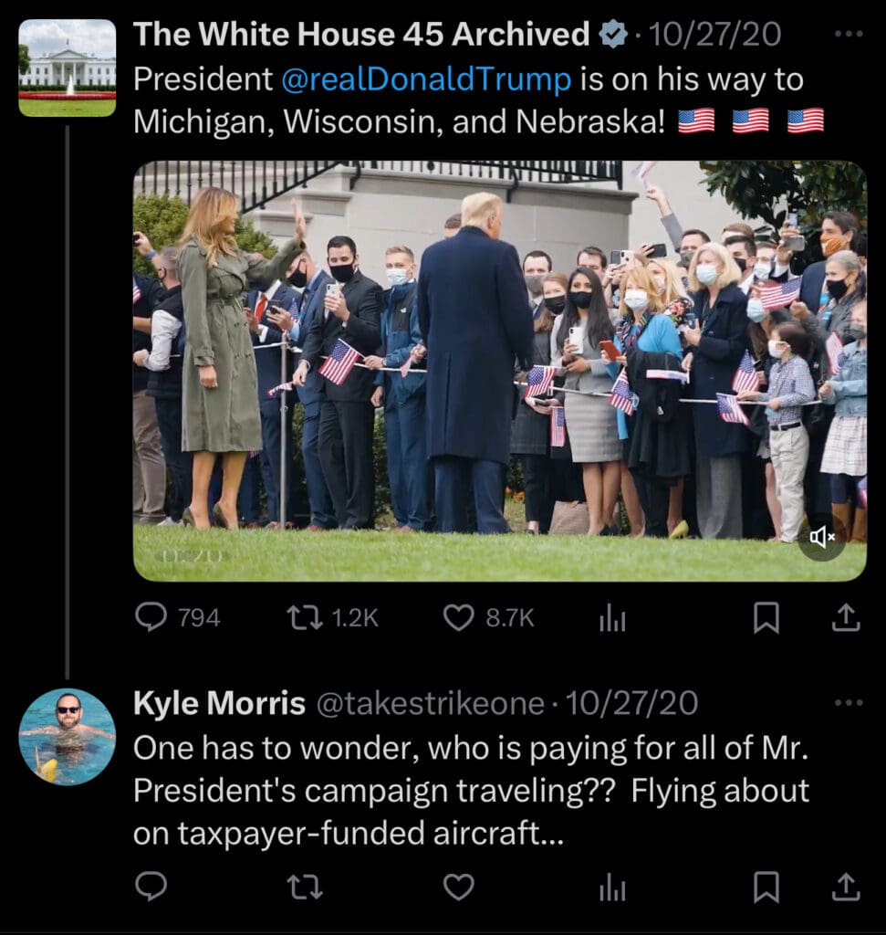 In October 2020, he questioned whether taxpayer dollars were being used for Trump’s travel.