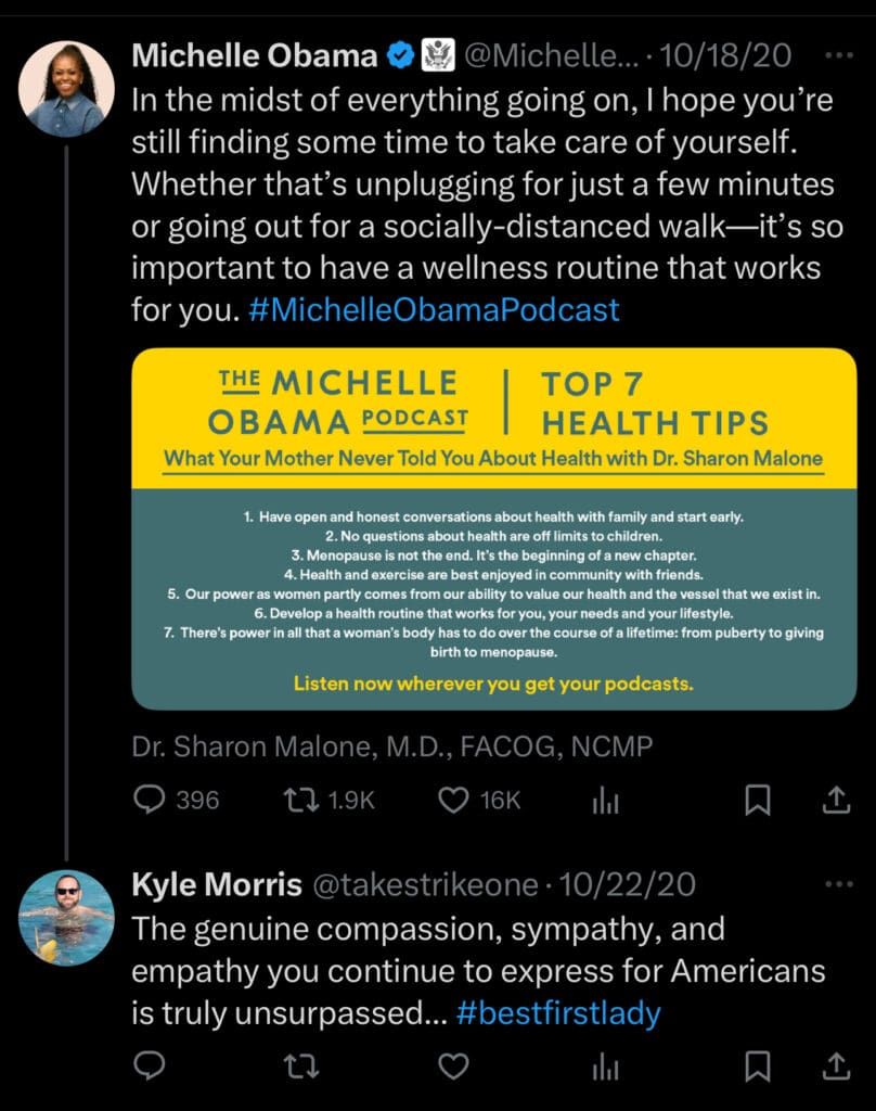 In response to a message from Michelle Obama about empathy and kindness, Morris said her comments reflected “genuine compassion, sympathy, and empathy,” calling her the “#bestfirstlady.”