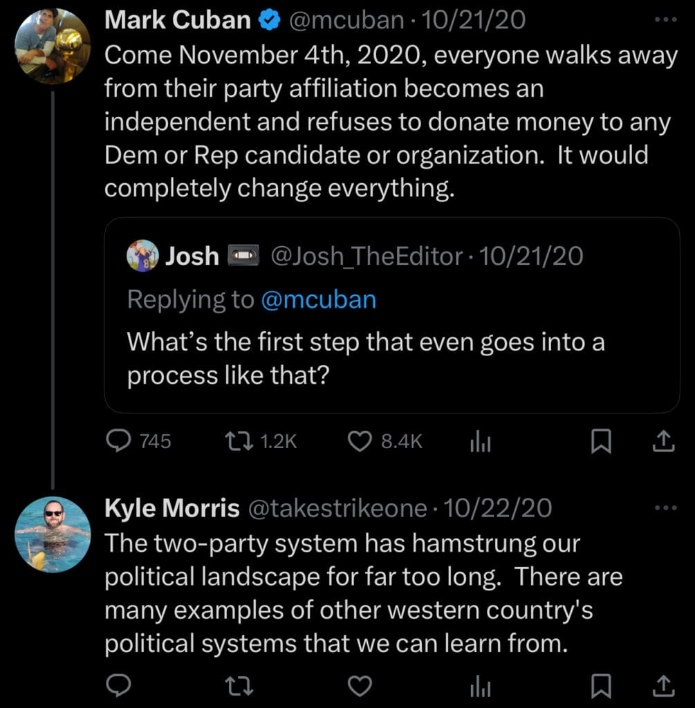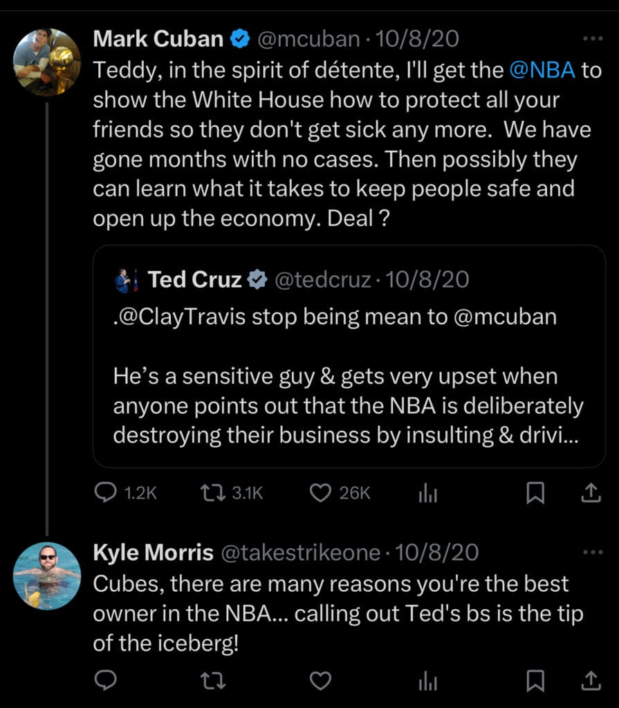In another post, he praised Mark Cuban for comments directed at Cruz, saying “calling out Ted’s bs is the tip of the iceberg.”