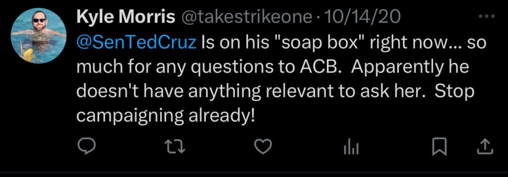 During the confirmation hearings for Justice Amy Coney Barrett, Morris objected to Sen. Ted Cruz’s remarks, writing: “Stop campaigning already.”