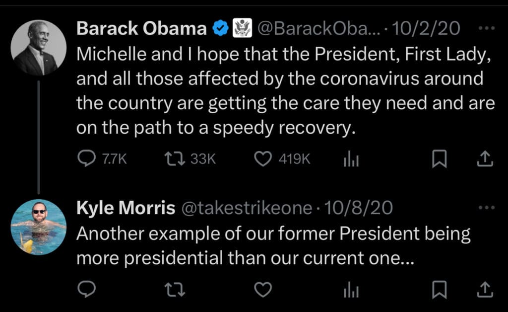 When former President Obama wished the Trumps well after their COVID-19 diagnoses, Morris wrote that it was “yet another example of our former President being more presidential than our current one.”
