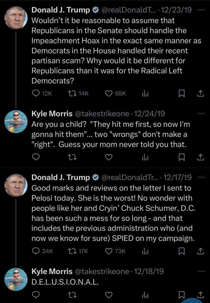 After Trump argued that the Senate should match House Democrats’ impeachment procedures, Morris replied: “Are you a child? … Two wrongs don’t make a right.”