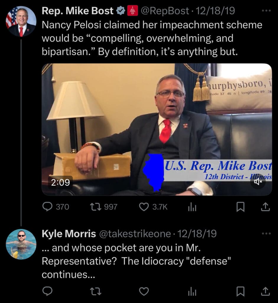 He questioned Republican Rep. Mike Bost after he criticized Nancy Pelosi, asking “whose pocket are you in,” and referred to one of the congressman’s arguments as part of an “Idiocracy ‘defense.’”