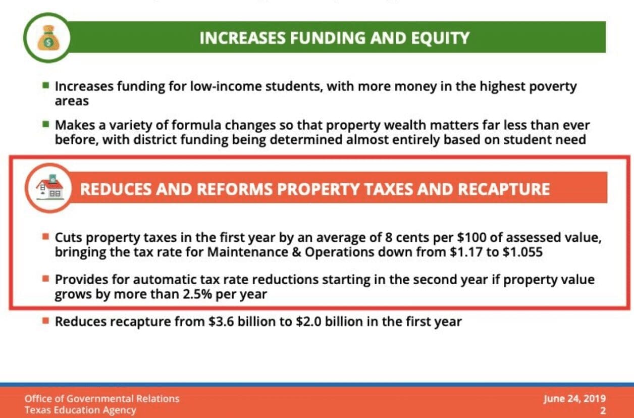 Although the exact rate reduction will vary from district to district, school tax rates across Texas are being reduced or “compressed” in 2019 due to lawmakers dedicating $5.1 billion to tax “relief.” The funds were appropriated in House Bill 3, which also included a massive increase in education funding, passed earlier this year by state lawmakers.