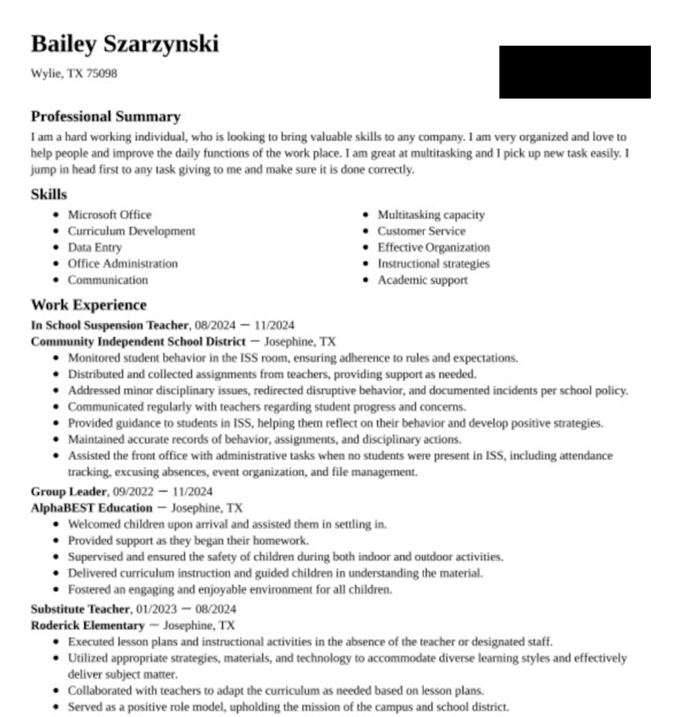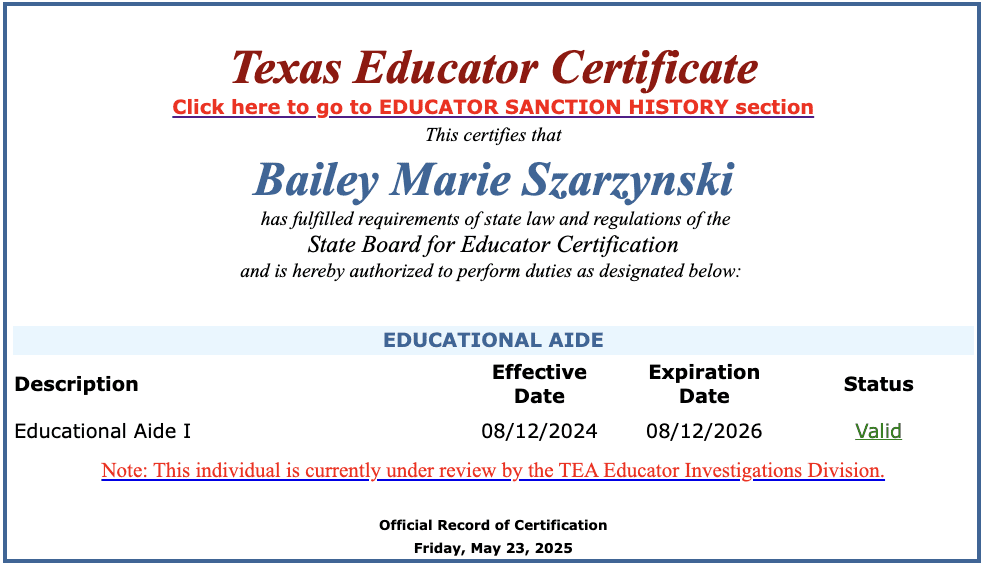 Community ISD in-school suspension aide Bailey Marie Szarzynski was arrested in February and charged with aggravated sexual assault of a child, a first-degree felony. According to Szarzynski’s resume, she worked for Community ISD from August to November 2024. Court records show the alleged offense occurred on October 29, 2024. Szarzynski was certified as an educational aide in August 2024. Her certificate is currently under review.