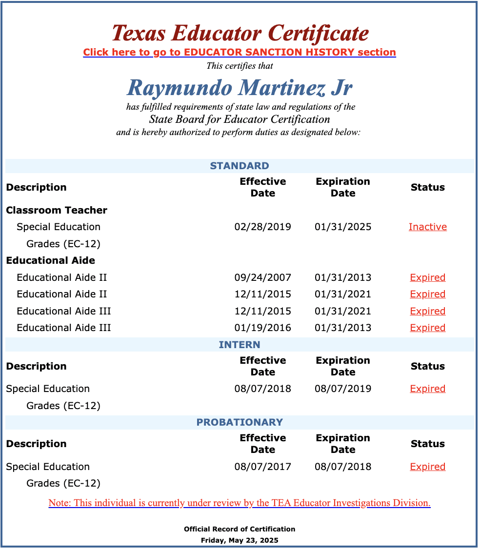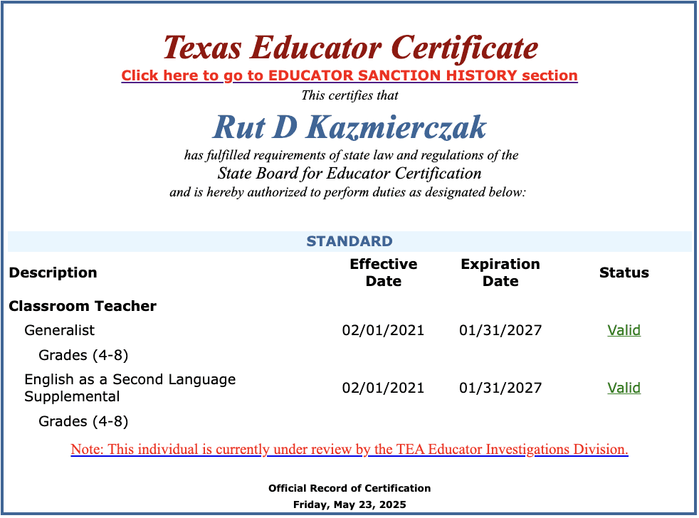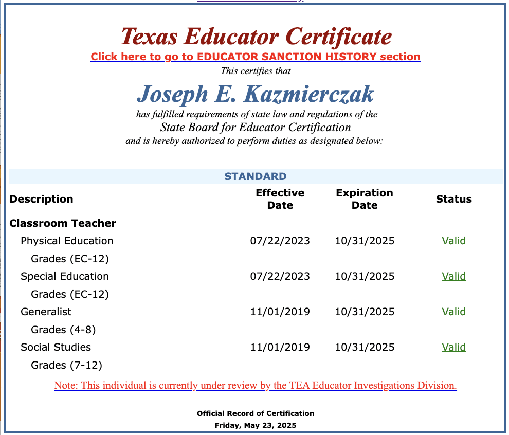 Kazmierczak’s wife Rut was a sixth grade reading teacher at J.D. Salinas Middle School in La Joya ISD. She was reported to the TEA in 2023 for improper relations with a student, but the agency didn’t open an investigation. Progress Times reported that although the district’s investigation found she violated policy, La Joya ISD allowed Kazmierczak to resign and “promised to refrain from making negative remarks about her to prospective future employers in a separation agreement meant to be secret.” Her teaching certificate is also under review.