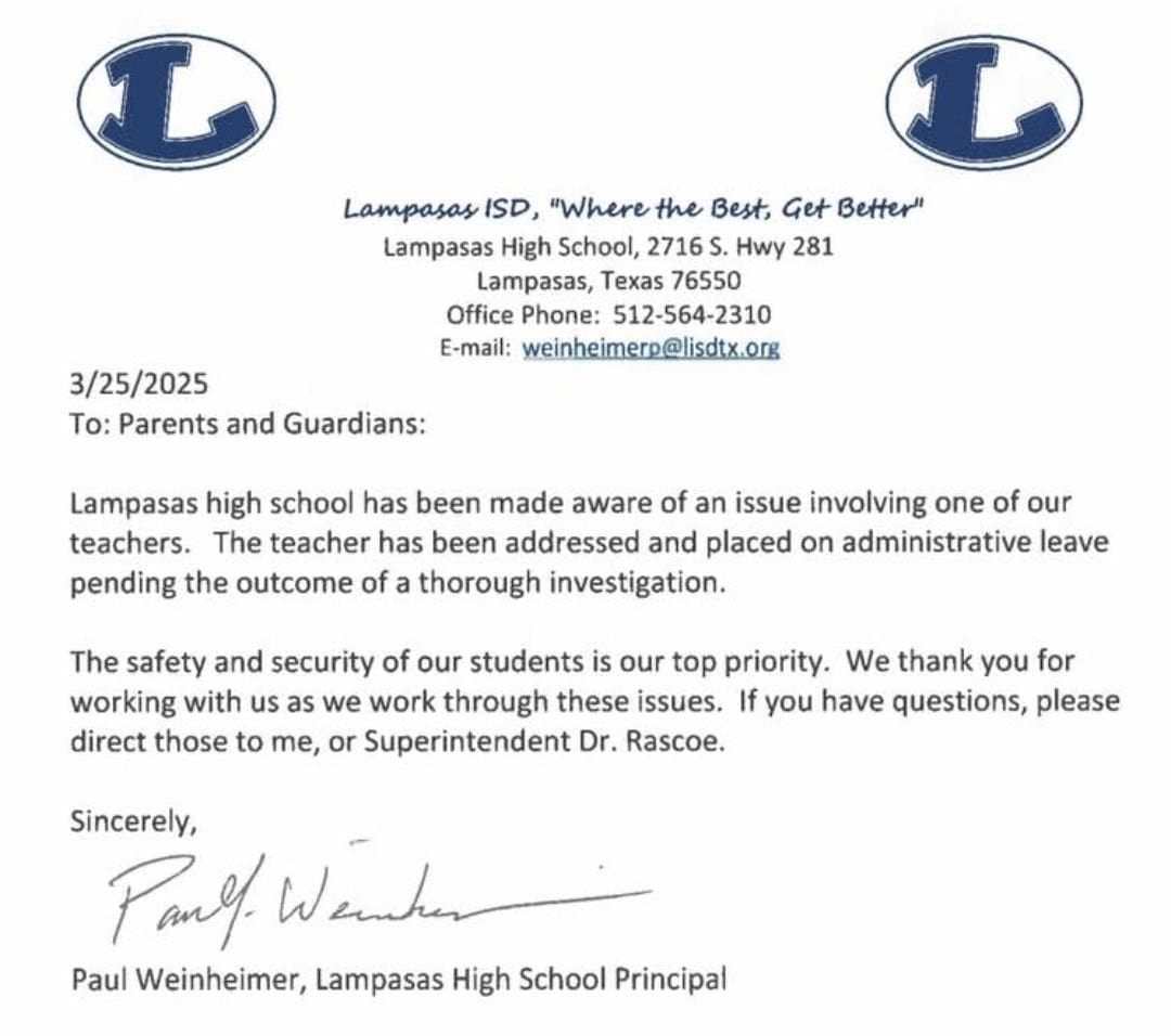 An unnamed Lampasas ISD high school teacher was placed on administrative leave in March over an unspecified “issue” while the district investigated. Another Lampasas ISD teacher resigned in January amid misconduct allegations.