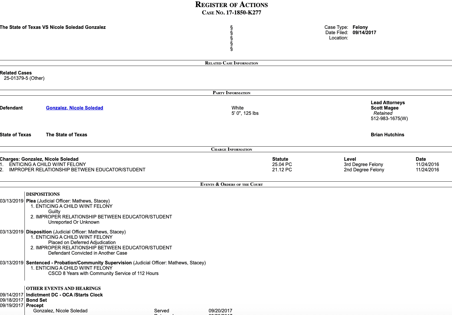 Former Round Rock ISD teacher Nicole Soledad Gonzalez Valenzuela was arrested on April 1 after being charged in March for driving while intoxicated. The DWI charge reactivated felony charges from 2017 of enticing a child and improper relationship between educator and student, for which she received eight years of deferred adjudication in 2019. State records show no teaching certificate or Do Not Hire Registry listing under either Gonzalez or Valenzuela.