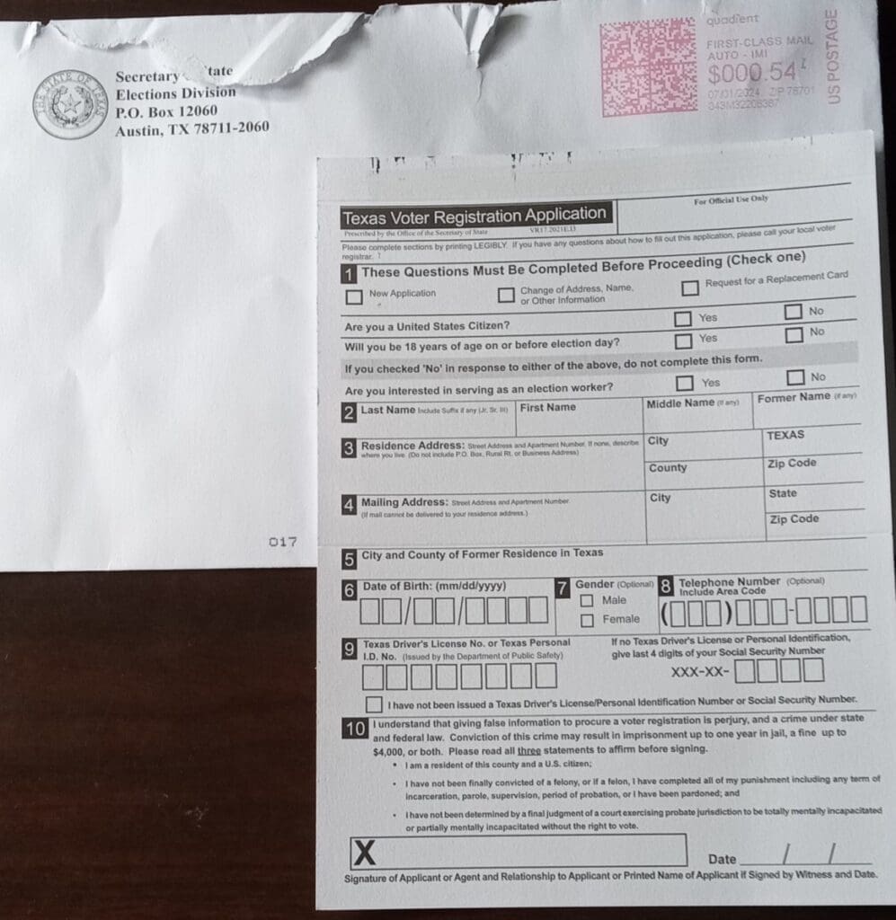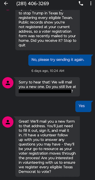 In a text exchange obtained by Texas Scorecard, “Dan” claimed “a voter registration form was recently mailed to your home.”